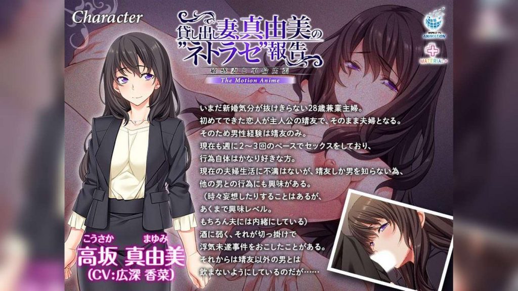 「アトリエさくら」のPCゲーム、「貸し出し妻、真由美の”ネトラセ”報告 敏感妻と不倫出張」」がモーションアニメ化!!主人公『高坂 靖友(こうさか やすとも)』はある日、ネットで自分の妻を他人に抱かせるという体験談を見て興味を持つ。自分としか経験が無い妻の真由美は他の男とどんなセックスをするのだろう。妄想はエスカレートしていき、ついにはその願望を打ち明けてしまう。そんな夫の願いを真由美は拒否するが、ついには熱意に負け、条件をつけて了承してしまう。『自分が信頼している男なら』……という条件で。そうして妻が”貸し出し先”に選んだのは、夫以外で唯一信頼している1つ年下のバツイチ上司、新開悟。悟とは出張で出かける事がよくあるので、その時に貸し出しが行なわれることになった。禁断の『不倫出張セックス』。二人の間でどんなセックスが行なわれたのか。それは妻が帰ってくるまでわからない。